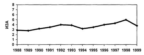 Рис. 12.5. Динамика изменения индекса загрязнения атмосферы Санкт-Петербурга за период 1988-1999 гг. (взвешенные вещества + диоксид азота + оксид углерода) Наименование индикатора: качество поверхностных вод. Этот индикатор характеризует уровень загрязненности поверхностных вод. Как рассчитывается данный индикатор. Качество поверхностных вод определяется величиной индекса загрязненности воды (ИЗВ). Этот индекс комплексно характеризует сумму нормированных (по ПДК) среднегодовых значений концентраций загрязняющих веществ и рассчитывается Северо-Западным УГМС на основе анализа регулярно проводимых гидрохимических измерений. Периодичность измерения. ИЗВ рассматривается ежегодно и, исходя из этих данных, поверхностные воды классифицируют по классам качества воды: 1 — «очень чистые», ИЗВ=0,3 II —«чистые», ИЗВ=0,3-1,0 III —«умеренно загрязненные», ИЗВ=1-2,5 IV — «загрязненные», ИЗВ=2,5-4 V — «грязные», ИЗВ=4-6 VI —«очень грязные», ИЗВ=6=10, VII — «очень грязные», ИЗВ более 10. Динамика индикатора. Величины, характеризующие состояние загрязненности водотоков Санкт-Петербурга по гидрохимическим показателям, приведены в табл. 12.7.