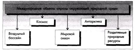 Объекты, по поводу которых разные страны вступают в экологические отношения называются объектами международного сотрудничества (рис. 14.1). Среди них выделяют две категории объектов: не входящие и входящие в юрисдикцию государств. Первые - это воздушный бассейн, космос. Мировой океан, Антарктика, мигрирующие виды животных. Эти объекты охраняются и используются в соответствии с нормами международного экологического права. Вторые - это объекты, входящие в юрисдикцию государств: международные реки, моря, озера; объекты мирового природного наследия, занесенные в Красную книгу исчезающих и редких животных и растений.