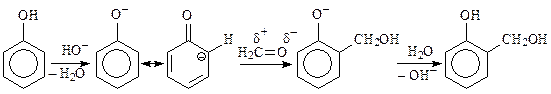 Гидроксиметилированием (алкилированием) называется процесс замены атома водорода на гидроксиметильную (гидроксиалкильную) группу (–СН2ОН, –RСНОН). Это разновидность реакций С-, N-, О-алкилирования. Реагентом являются альдегиды. В реакцию вступают алифатические, ароматические и гетероциклические соединения. Для С-гидроксиметилирования аренов используется формальдегид. Реакция идет только с активированными соединениями. Фенол реагирует с формальдегидом в присутствии разбавленных кислот или щелочей. При этом в зависимости от условий реакции и соотношения реагентов образуется смесь салицилового и п- гидроксибензилового спирта, ди- и тригидроксиметилфенолов, а при взаимодействии гидроксиметилфенолов с фенолом и между собой — димеры и полимеры (бакелитовые лаки и фенолформальдегидная смола).