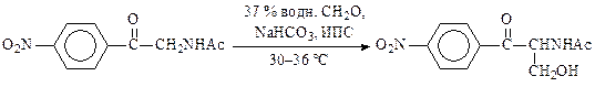С-Гидроксиметилирование алифатических соединений или в боковую цепь аренов реализуется лишь при наличии С–Н-кислотности. В синтезе левомицетина используется кислотность α-С–Н связей кетона (1-(п -нитрофенил)-2-ацетиламино-1-этанона). При взаимодействии с основанием он образует нуклеофил, который присоединяется по С=О группе формальдегида, образуя гидроксиметильную группу: