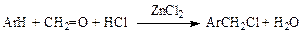 Замена атома водорода в молекулах органических соединений на галогенметильную группу (СН2Hlg) называется реакцией галогенметилирования. Она применяются в основном для получения «бензильных» галогенидов изароматических соединений. В качестве реагентов используются формальдегид и галогеноводород в присутствии катализатора. При пропускании хлористого водорода через смесь ароматического углеводорода и формалина в присутствии хлорида цинка при температурах не более 50—60 °С образуются производные хлористого бензила (последовательно реализуются электрофильное и нуклеофильное замещение):