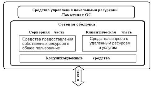· средства предоставления собственных ресурсов и услуг в общее пользование (серверная часть сетевой ОС) обеспечивают обработку запросов удаленного доступа к собственной файловой системе и базе данных, управление очередями запросов удаленных пользователей к своим периферийным устройствам и т.д.; · средства запроса доступа к удаленным ресурсам и услугам и их использование (клиентская часть сетевой ОС) формируют и перенаправляют в сеть запросы к удаленным ресурсам от приложений и пользователей. · коммуникационные средства ОС реализуют обмен сообщениями в сети, обеспечивая адресацию сообщений и выбор маршрута передачи сообщений по сети.