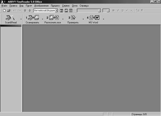 Кращих результатів можна досягти в разі сканування поетапно, використовуючи панелі інструментів, оскільки при цьому забезпечується більший контроль проміжних підсумків і можна, оперативно втрутившись, поліпшити якість сканування. Процес оброблення документа складається з п'яти етапів: 1. Сканування документа (кнопка 1). 2. Сегментація документа (вертикальна панель інструментів або меню Изображение). 3. Розпізнавання документа (кнопка 2). 4. Редагування і перевірка результату (кнопка 3). 5. Збереження документа (кнопка 4). Із кожною кнопкою панелі інструментів пов'язано меню, один із пунктів якого є в даний момент активним.
