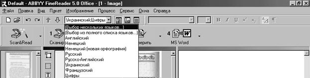 1 2 3 4 5 6 7 8 9 10 11 12 Кнопки (в порядку їх нумерації) дають змогу: 1. Виконати автоматичну сегментацію. 2. Виділити і зробити аналіз поточного блоку. 3. Виділити текстовий блок. 4. Виділити табличний блок. 5. Виділити блок малюнку. 6. Виділити для редагування поточний блок. 7. Додати вертикальну лінію в табличному блоці. 8. Додати горизонтальну лінію в табличному блоці. 9. Вилучити вертикальну лінію із табличного блоку. 10. Зменшити масштаб перегляду у вікні «Изображение». 11. Збільшити масштаб перегляду у вікні «Изображение». У контекстному меню можна вилучити один або всі блоки, змінити тип блока, очистити блок. Після сегментації можна розпочинати розпізнавання тексту. 4. Розпізнавання тексту Етап розпізнавання тексту починається після клацання мишею на кнопці «2.Распознать» і повністю автоматизується. З метою зменшення помилок розпізнавання необхідно правильно встановити мову документа, вибравши її зі списку на панелі інструментів за допомогою миші. Якщо документ містить фрагменти на різних мовах, то потрібні мови вибираються встановленням в списку прапорців напроти відповідної мови.