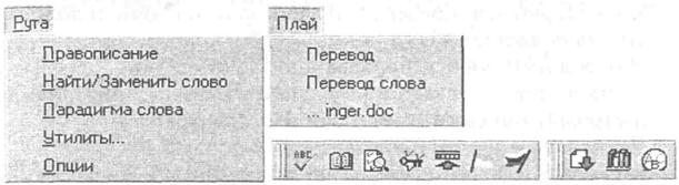 6. Переклад тексту за допомогою програми Plaj-Ruta. Ідея використання комп'ютера для автоматичного перекладу текстів виникла ще на початку появи ОТ. Для автоматичного перекладу документів з однієї мови на іншу розроблено багато різних програм. Однак через складнощі опису семантики природних мов до цього часу остаточно проблему перекладу ще не вирішено. Значно полегшити роботу з документами можна, користуючись програмним забезпеченням, орієнтованим на автоматичний переклад та автоматичну перевірку правопису. Розробники програмних пакетів пішли ще далі у процесі підвищення зручності для користувача: більшість із цих програм при інсталяції інтегруються в пакет Microsoft Office. Якщо треба швидко перекласти документ чи фрагмент тексту з російської на українську мову чи навпаки, у кожному з напрямків, доцільно скористатись програмою Plaj-Ruta, що входить до складу пакета програм ProLing Office. Програмні засоби Рута, Плай фірми ПроЛінг призначені для перевірки орфографії, граматики текстів українською, російською мовами та їх взаємного перекладу. Вони теж інтегровані в пакет Microsoft Office, їх меню та панелі інструментів показані на рис. нижче.