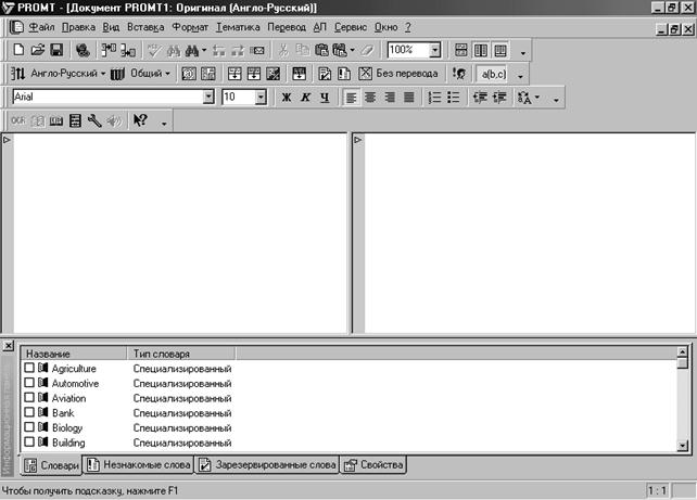 7. Переклад тексту за допомогою програми Promt. Цю програму (її більш ранні версії відомо під назвою Stylus [Стайлус]) розроблено російською фірмою PROMT. Програма є додатком до ОС, таких як Windows 95, 98, NT 4.0, і може бути інтегрована в комплект програм Microsoft Office, зокрема у програми Microsoft Word та Excel. Можливості програми PROMT: • забезпечення перекладу документів з англійської, німецької та французької мов на російську і навпаки; • до неї можна підключати кілька десятків спеціалізованих словників, що забезпечує правильний переклад термінів, які стосуються певної області знань; • динамічне відслідковування напрямку перекладу, тобто визначення мови оригіналу і перекладу; • переклад вмісту буфера обміну, поточного параграфа, виділеного фрагмента тексту або всього тексту; • забезпечення будь-якого з можливих напрямків перекладу, підключення і відключення словників, доповнення та виправлення їх, складання списку зарезервованих слів, які не перекладаються; • робота безпосередньо з програмами розпізнавання текстів, наприклад FineReader; • не виходячи з програми можна використати відомі способи редагування і форматування оригіналу та перекладу; • забезпечення перевірки орфографії оригіналу і перекладу після встановлення додатків для перевірки правопису (LingvoCorrector, Пропис, Орфо, Hugo). Програма запускається або клацанням мишею на значку програми, або за командою Пуск—Программы— PROMT – PROMT. Після запуску програми відкривається вікно, що складається з трьох областей: дві призначені для відображення оригіналу тексту і його перекладу, третя — утворює інформаційну панель, де відображаються інформація про перекладений документ і спеціальні настройки. Є можливість розташувати області початкового тексту і перекладу поряд або одну над одною. Вікно має стандартні елементи вікна Windows 98 — заголовок, рядок меню, панелі інструментів.