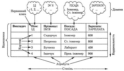 Основними поняттями реляційних баз даних є: тип даних, домен, атрибут, кортеж, первинний ключ і відношення