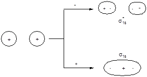 Метод МО рассматривает молекулу как единое образование, в котором каждый электрон принадлежит частице и движется по молекулярным орбиталям в поле всех ядер и остальных электронов молекулы. Молекулярная орбиталь - это область пространства в молекуле, вероятность нахождения электрона в которой существенно отличается от нуля. В отличие от атомной орбитали (АО), молекулярная орбиталь (МО) многоцентрова и охватывает несколько ядер. Заполнение молекулярных орбиталей электронами происходит в порядке увеличения их энергии с соблюдением принципа запрета Паули и правила Гунда. Волновая функция МО (y) конструируется как линейная комбинация волновых функций АО (ji): y = АО, пригодные для составления МО, должны иметь близкую энергию, одинаковую симметрию и перекрываться в заметной степени. При этом число полученных МО равно числу исходных АО. Различают три типа молекулярных орбиталей: связывающие, разрыхляющие (антисвязывающие) и несвязывающие. Связывающие МО имеют энергию, меньшую по сравнению с исходными атомными орбиталями. Их заполнение стабилизирует молекулу. Разрыхляющие молекулярные орбитали имеют энергию более высокую по отношению к исходным АО. Заполнение электронами разрыхляющих МО ведет к дестабилизации частицы. Несвязывающие МО локализованы на отдельных атомах и фактически представляют собой атомные орбитали, перенесенные в молекулу без изменения. По симметрии МО разделяют на s (симметричные относительно линии связи) и p (антисимметричные относительно линии связи). Последние меняют знак волновой функции при повороте вокруг линии связи. Рассмотрим электронное строение двухатомных молекул, образованных элементами первого периода. В качестве базисного набора АО будем использовать 1s-орбитали, линейные комбинации волновых функций которых дадут y-функции двух молекулярных орбиталей: