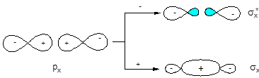 При конструировании МО двухатомных гомоядерных молекул, образованных элементами второго периода, в качестве исходных АО можно использовать 2s- и 2p-орбитали. 1s-Орбитали входят в состав молекулы без изменения, т.е. являются несвязывающими. Схема и результат взаимодействия волновых функций 2s-орбиталей аналогичны рассмотренным выше для s-орбиталей элементов первого периода. 2px-Орбитали, ориентированные по линии связи, взаимодействуют с образованием двух s-МО:
