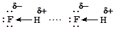 Нижняя зона, в которой расположены электроны, осуществляющие образование химической связи, называется валентной зоной. Электроны, расположенные в этой зоне, у ковалентных и ионных кристаллов локализованы в определенных областях пространства и не способны перемещаться по кристаллу. Верхняя энергетическая зона называется зоной проводимости. Поскольку она вакантна, попадая в нее, электроны могут свободно перемещаться по всему кристаллу, осуществляя проводимость электрического тока. На энергетической диаграмме кристалла существует еще одна область значений энергий, которые электроны принимать не могут - запрещенная зона. Ее ширина обычно и определяет свойства кристалла. Если ширина запрещенной зоны DЕ > 3,0 эВ, то никакими внешними воздействиями электроны не могут быть переведены из валентной зоны в зону проводимости и кристалл является диэлектриком. При ширине запретной зоны в пределах 0,1 - 3,0 эВ возможен перевод части электронов из валентной зоны в зону проводимости под влиянием внешнего воздействия (облучения светом или повышения температуры). Такой кристалл будет полупроводником. И наконец, при ширине запретной зоны меньше 0,1 эВ фактически происходит перекрывание валентной зоны и зоны проводимости и электроны, осуществляющие химическую связь, могут свободно перемещаться по всему кристаллу, который будет обладать электронной проводимостью, т.е. будет проявлять свойства металла. Водородной связью называется электростатическое взаимодействие атома водорода, связанного с сильно электроотрицательным элементом, с другими атомами. Прочные водородные связи образует атом водорода, связанный с атомом фтора, кислорода или азота. Электроотрицательность других элементов недостаточна для того, чтобы заставить связанный с ними атом водорода образовать водородную связь. Механизм образования водородной связи рассмотрим на примере взаимодействия молекул фтороводорода. Высокая электроотрицательность атома фтора приводит к тому, что связь водород-фтор в данной молекуле сильно полярна и общая пара электронов смещена к фтору H®F. Поскольку у атома водорода отсутствует внутренняя электронная оболочка, оттягивание его валентного электрона почти полностью обнажает ядро, представляющего собой элементарную частицу - протон. По этой причине сильно поляризованный атом водорода обладает очень мощным электростатическим полем, за счет которого он притягивается к атому фтора другой молекулы фтороводорода с образованием водородной связи. Значительный вклад в образование водородной связи вносит донорно-акцепторное взаимодействие "вакантной" 1s-орбитали атома водорода с неподеленной электронной парой атома фтора.