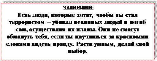Большое внимание в планах террористов отводится подростковому возрасту. Хотя, террористам чаще нужны взрослые и сильные мужчины и женщины, заполучить их в свои ряды террористы смогут, если сформируют у людей приверженность своим теориям и идеям. Подростковый возраст как нельзя более подходит для этих целей. Именно в 10-15 лет начинает закладываться мировоззрение человека, формируется понимание себя, окружающих, общества. Расспросите взрослых и многие скажут, что подростковый возраст – это возраст переломный, переходный, критический. Его считают периодом бурных внутренних переживаний и эмоциональных трудностей. По результатам опроса, проведенного среди подростков, половина 14-летних временами чувствуют себя настолько несчастными, что плачут и хотят бросить всех и все. Четверть сообщила, что им кажется иногда, что люди смотрят на них, говорят о них, смеются над ними. Характерные черты этого возраста - чувствительность, частая резкая смена настроения, боязнь насмешек, снижение самооценки. В этот период появляется «чувство взрослости» - отношение подростка к себе как к взрослому. Это выражается в желании, чтобы все - и взрослые, и сверстники - относились к тебе не как к маленькому, а как к взрослому. Стремление к равноправию в отношениях со старшими часто ведет к конфликтам. Чувство взрослости проявляется и в стремлении к самостоятельности, желании оградить какие-то стороны своей жизни от вмешательства родителей. Романтизм и стремление к идеальному делает подростков особенно отзывчивыми на любые начинания, требующие напряжения сил, подвига, героизма. Помимо уже отмеченного желания проявить мужество, героизм, в вашем возрасте начинает проявляться такая черта как максимализм. Максимализм выражается как стремление к резким, крайним суждениям, однозначным выводам, неприятию полутонов. Все воспринимается или как хорошее или как плохое. А с плохим хочется покончить быстрыми и резкими мерами. Часто можно слышать, как ребята обсуждают какую-либо придуманную или реальную историю: «а, взорвать их всех…», «… все потонули – так им и надо». Такая тяга к экстремизму вполне обычное явление, присущее подростку. Сама по себе эта тенденция не опасна и обычно проходит к взрослому возрасту. Но хитрые проповедники террористических идей могут использовать такую особенность подросткового и молодежного сознания – «подсовывая» экстремальный выбор. Свойственная этому возрасту идеализация, желание изменить мир, вера в свои силы и лучшее будущее, приводит к завышенности оценок и притязаний, мешает правильно оценить действительность, порождая пессимизм и апатию. Социальная активность подростка часто принимает форму абстрактной социальной критики, он фиксирует свое внимание на том, что его не удовлетворяет, что не соответствует его идеалу. Примером может служить резкость и безапелляционность критических суждений о ситуации в стране, в республике, в городе или поселке, в школе. Это состояние стараются использовать различного рода политические и религиозные течения, пытаясь внушить подростку, что все недостатки, которые он видит, могут быть устранены путем радикальных действий.