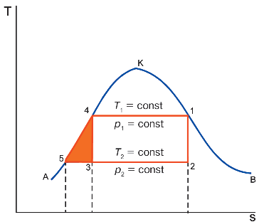 Чтобы уменьшить расход энергии на сжатие, целесообразно провести конденсацию пара до конца (точка 5). В этом случае будет сжиматься вода, которая практически не меняет плотности и имеет малый удельный объем. Поэтому выполняемая работа сжатия будет незначительной и пойдет лишь на проталкивание воды до достижения рабочего давления p 1. На отрезке 5 – 4 будет происходить изобарный нагрев воды до температуры T 1. Цикл паросиловой установки с полной конденсацией водяного пара называют циклом Ренкина. Его к.п.д. меньше теоретического к.п.д. цикла Карно, но именно цикл Ренкина применяется в паросиловых установках современных тепловых и атомных электростанций. В этих установках котел (или парогенератор) вырабатывает перегретый или насыщенный пар, который поступает в паровую турбину. Отработавший пар, имеющий более низкие температуру и давление, конденсируется и возвращается в цикл. Развитие паровых двигателей начиная с XIX столетия шло в направлении повышения к.п.д. и увеличения быстроходности. Для повышения их к.п.д. стали на путь увеличения рабочего давления пара и применения многократного его расширения. Для этой цели в паровых двигателях стали применять перегретый пар. При этом повышается к.п.д. цикла Ренкина (рис.1.3). Сухой насыщенный пар из парового котла направляется в пароперегреватели для изобарного нагрева при давлении p 1(точка 1 диаграммы). Расширение в турбине перегретого пара соответствует адиабате 1 – 2. Процесс конденсации пара в конденсаторе описывается отрезком 2 – 2′. После конденсатора с помощью питательного насоса давление воды повышается до рабочего практически при постоянном объеме (изохорный процесс 2′ – 3), и она поступает в паровой котел. Отрезок 3 – 4 отвечает процессу нагрева воды в котле до температуры ее кипения при давлении p 1. Из рис. 1.3 видно, что при применении перегретого пара термический к.п.д. цикла Ренкина выше, чем для цикла с насыщенным паром, так как выше средняя температура подвода теплоты.
