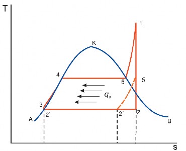 Из вышесказанного следует,что термический к.п.д. паросиловой установки тем выше, чем больше перепад энтальпий на входе и выходе паровой турбины. Поэтому для увеличения к.п.д. следует повышать параметры острого пара (давление p 1и температуру T 1) и снижать давление в конце расширения p 2 (в конденсаторе). Наибольший эффект от повышения энтальпии острого пара достигается при одновременном увеличении давления и температуры (рис. 1.4), что объясняет тенденцию внедрения установок с максимально высокими параметрами пара. Значения p1 и T1 ограничиваются жаропрочными характеристиками металлов, из которых изготовлено оборудование паросиловой установки. Минимально возможный уровень конечного давления p 2определяется оптимальным соотношением затрат, требуемых для его достижения, и термодинамической выгодой, которая будет получена при снижении конечного давления до уровня p 2. В реальных условиях давление в конденсаторе составляет p 2= 1–3,5 кПа, что намного меньше атмосферного. Однако рост начального давления и снижение конечного одновременно с увеличением перепада энтальпий приводят к повышению влажности пара в конце расширения (точка 2 на рис. 1.4). В реальной турбине конечная влажность пара не должна превышать 12%. При большей влажности происходит снижение к.п.д. турбины и увеличивается механический износ ее лопаток каплями влаги. Поэтому для поддержания допустимой влажности при возрастании параметров острого пара используют промежуточный перегрев: после ступени высокого давления, в которой пар становится насыщенным (точка 6), он направляется в перегреватель, расположенный в котельном агрегате, в котором он нагревается до рабочей температуры T 1 (участок 6 – 1′), и дальше возвращается в последующие за точкой отбора ступени турбины (отрезок 1′ – 2′). Из рис. 1.4 видно, что влажность точки 2′ меньше, чем точки 2. Промежуточный перегрев пара одновременно приводит также к росту эффективности цикла паросиловой установки, так как прибавляется полезная работа, эквивалентная площади 6 – 1′ – 2′ – 2. Таким образом, в современной тепловой и атомной энергетике основным рабочим телом является водяной пар, продуцируемый в паровых котлах тепловых электростанций или в парогенераторах атомных электростанций. Доля газотурбинных электростанций, на которых рабочим телом является смесь воздуха с продуктами сгорания топлива, в мировой электроэнергетике до последнего времени относительно невелика. Конец ХХ и начало XXI века в мире характеризуются разработкой и использованием электростанций на низкокипящих рабочих телах, которые в сочетании с водяными паросиловыми установками позволяют более полно использовать теплоту топлива. Происхождение большинства типов низкокипящих рабочих тел имеет природный характер – это углеводороды, водоаммиачный раствор, диоксид углерода. Из синтезированных можно выделить фторуглероды (FC) с нулевым воздействием на озоновый слой атмосферы и силиконовое масло. Подробнее паросиловые установки на низкокипящих рабочих телах будут рассмотрены в других книгах.