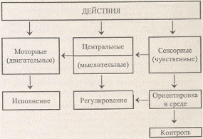 Всякое действие представляет собой сложную систему, состоящую из нескольких частей: ориентировочная (управляющая), исполнительная (рабочая) и контрольно-корректировочная. Ориентировочная часть действия обеспечивает отражение совокупности объективных условий, необходимых для успешного выполнения данного действия. Исполнительная часть осуществляет заданные преобразования в объекте действия. Контрольная часть отслеживает ход выполнения действия, сопоставляет полученные результаты с заданными образцами и при необходимости обеспечивает коррекцию как ориентировочной, так и исполнительной частей действия.