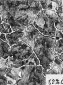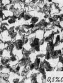 Рис. 1. Мікроструктура сталей залежно від вмісту вуглецю ( х450 ) За способом виплавки: v в мартенівських печах; v в кисневих печах; v в електричних (електродугових, індукційних і ін.). За призначенням: v сталі конструкційні (С= до 0,85 %); v сталі інструментальні (С=0,7–1,4 %); v спеціальні – сталі з особливими властивостями (електротехнічними, магнітними і ін.). Конструкційні сталі в свою чергу поділяються на: сталі звичайної якості, якісні, автоматні, ливарні. Конструкційні сталі постачаються заводами-виробниками гарячокатаними, холоднотягнутими або кованими. Інструментальні сталі випускаються двох груп: якісні та високоякісні. Сталі звичайної якості (ГОСТ 380) поділяються на три групи: А, Б и В. Група А це сталі Ст0, Ст1, Ст2, Ст3, Ст4, Ст5, Ст6. У цих сталей нормуються механічні властивості (σв, σт, δ). Цифра в марці сталі означає її умовний номер і змінюється від 0 до 6, чим більше ця цифра, тим більше значення σв і σт. Різновид сталей групи А за розкисленням показано у додатку 1. Індекси Б і В вказуються в марках сталей групи Б і В, а індекс А в сталей групи А не вказується. У сталей групи Б нормується хімічний склад за вуглецем (від 0,23 до 0,49%), кремнію (0,05...0,35 %) і марганцю (0,25...1,2 %): БСт0, БСт1,..., БСт6. Повторюються ті ж різновиди сталей як і у групі А за розкисленням та за вмісту марганцю: БСт0, БСт1кп, БСт1пс,..., БСт6 (додаток 2). Група В – нормується хімічний склад і механічні властивості: ВСт1, ВСт2, ВСт3, ВСт4, ВСт5 (індекс В – група сталі В, у відмінності від сталей груп А і Б у групі В немає сталей Ст0, Ст6). Приклади розшифровки позначень сталей: сталь Ст2кп3 - сталь звичайної якості групи А, марки Ст2, що кипить, 3-їй категорії; сталь ВСт4кп4 - сталь звичайної якості, групи В, марки Ст 4, що кипить, 4-ої категорії. Якісні вуглецеві стали можуть бути зі звичайним змістом марганцю (05кп, 08кп,..., 25,..., 85) і з підвищеним (15Г, 20Г,..., 85Г). Цифра в марці означає вміст вуглецю в сотих частках %, а індекс Г указує на наявність марганцю (1%). Високоякісні сталі містять менше кількість шкідливих приміток (S < 0,02 %, Р < 0,02 %) і позначаються індексом А в кінці марки сталі, наприклад: У8А – високоякісна високовуглецева інструментальна сталь, що містить 0,8 % вуглецю. Застосування вуглецевих сталей у будівництві й машинобудуванні: Ø Сталі звичайної якості використають у конструкціях, що не піддають динамічним навантаженням і впливу низьких температур. Ø Сталі 08кп, 05кп – для листового штампування в автомобілебудуванні й інших галузях. Ø Сталі Ст0, Ст1,...Ст2, Ст08,... Ст25 – для виготовлення прокату листа, швелера й т.д. Ø Сталі 10, 15,..., 25 – для зварених і клепаних конструкцій (без наступної термообробки). Ø Сталі Ст3кп, Ст5, МСт3кп, і ін. для виготовлення залізобетонних виробів. Ø Листові конструкції, резервуари, трубопроводи виготовляють зі сталей МСт1кп, МСт2кп,...МСт3пс. Ø Сталі 30, 35, 40 – для деталей (вали, осі, шестірні), що працюють при більших навантаженнях (піддаються нормалізації й загартуванню). Ø Сталі 45, 50 – для колінчатих валів. Ø Сталі 55, 60, 65 й 70 – пружини, ресори, шестірні (гартування і відпуск).