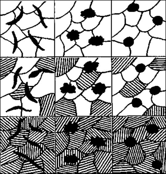 Рис. 2. Форма графіту і мікроструктура чавунів Кулястий (глобулярний) графіт, що має мінімальну поверхню при даному об’ємі, значно менше, ніж пластинчатий графіт, послаблює металеву основу чавуну, не є активним концентратором напружень. Тому високоміцні чавуни мають високі механічні показники, які не поступаються вуглецевій сталі, зберігаючи при цьому позитивні властивості чавуну: добрі ливарні якості, оброблення різанням, високу стійкість до спрацювання і таке ін. Високоміцні чавуни застосовуються для виготовлення деталей машин, на які діють ударні навантаження, змінні напруження, наприклад пресового обладнання, картерів, втулок, корпусів, насосів, вентилів і т.д. За ДСТУ 7293 передбачено такі марки високоміцних чавунів: ВЧ39-17, ВЧ42-12, ВЧ45-5, ВЧ60-2, ВЧ70-2, ВЧ80-2, ВЧ100-2, ВЧ120-2. Перші дві цифри вказують на границю міцності за розтягування (σв) в кгс/мм2, останні цифри – відносне видовження в %. Ковкими називають чавуни, в яких увесь або майже увесь вуглець міститься у вільному стані і має пластівцеподібну форму. Отримують його тривалим відпалюванням білого чавуну за високих температур. Залежно від режиму відпалювання отримують чавуни з різною металевою основою. На рис. 3 зображена схема відпалювання. За температури 950–1000 ºС відбувається перша стадія графітизації вторинного цементиту білого чавуну (Fe3C→Feγ(C) + С (графіт)). Графіт, який утворюється, має пластівцеподібну форму. В процесі охолодження аустеніт, що залишився, перетворюється на перліт, отриманий ковкий чавун має структуру – перліт і графіт. Якщо після першої стадії графітизації чавун повільно охолодити до температури 700–720 ºС, дати тривалу витримку, проходить друга стадія графітизації (Fe3C→Feα(C) + С (графіт)). Вторинний цементит перліту перетворюється на графіт. При цьому утворюється феритний ковкий чавун. Якщо процес перервати при другій стадії графітизації, цементит, що входить до складу перліту, розпадається не до кінця, і чавун буде мати феритно-перлітну основу. Ковкий чавун за технологічними і механічними властивостями займає проміжне положення між сталлю та сірим чавуном. Він має меншу, ніж сталь, чутливість до надрізів і значну величину внутрішнього тертя, більш високі показники (ніж сірі чавуни) границі міцності, відносного видовження, ударної в'язкості. Це дозволяє отримуватиіз ковких чавунів деталі високої міцності, довготривалості та експлуатаційної надійності. Тонкостінні (7–8 мм) деталі із ковких чавунів витримують гідравлічні тиски до 4 МПа, що дозволяє широко застосовувати цей чавун для деталей водо-, газо- та паропровідних пристроїв. Із ферметних ковких чавунів марок КЧ37-12, КЧ35-10 виготовляють деталі, що експлуатуються при високих динамічних і статичних навантаженнях: картери редукторів, ступиці, гаки, скоби та ін.