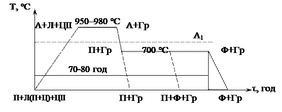 Рис. 3. Графік відпалювання білого чавуну на ковкий Перлитні чавуни марок КЧ45-7, КЧ50-5 володіють високою міцністю, достатньою пластичністю та добрими антифрикційними властивостями. Із них виготовляють вилки карданних валів, втулки, муфти, гальмівні колодки і т.д.