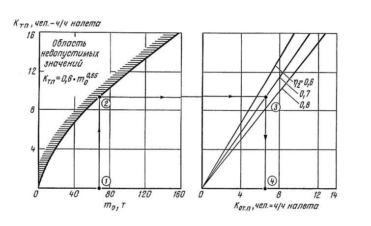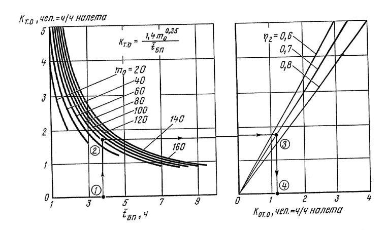 В качестве основы для разработки предложений принимаются полученные характеристики проектируемого ПТЭ (табл. 3.18). Среди всех состояний ПТЭ, кроме состояния использования по назначению "П" выделяются состояния с наибольшими значениями характеристик pi×mi и pi×ti (доминирующие состояния). Предложения по совершенствованию ПТЭ должны быть разработаны с учетом результатов, полученных в предыдущих разделах курсовой работы, и направлены на уменьшение количества попаданий ЛА в выделенные доминирующие состояния ПТЭ, а также на сокращение времени пребывания и трудовых затрат в этих состояниях. Предложения разрабатываются в двух направлениях: а) в направлении совершенствованная процессов технического обслуживания ЛА; б) в направлении улучшения эксплуатационной технологичности конструкции ЛА. Выполняется сравнение полученных в разделе 3.2. фактических значений обобщенных показателей ЭТ КОП и КОТ с нормативными значениями этих показателей для ЛА подобного класса. Для определения нормативных значений показателей КОП и КОТ используется номограммы (Приложение 11), полученные при исследовании большого объема наблюдений за эксплуатацией парка ЛА различных типов. Исходные данные, необходимые для решения этой задачи, приведены в соответствующих приложениях. Так, исходными данными для определения нормативного значения показателя КОП для интересующего типа ЛА являются: ТГСС - средний годовой налет на списочный самолет (Приложение 4); КСЕЗ - коэффициент сезонности (Приложение 11); h1 - статистический коэффициент (Приложение 11). С помощью номограмм (Приложение 11, рис. П11.1 и П11.2) определяются нормативные значения показателей: КОП.О - для оперативного цикла эксплуатации; КОП.П - для цикла восстановления. В сумме значения этих показателей дадут нормативное значение искомого показателя КОП - удельной суммарной оперативной продолжительности ТОиР ЛА. Исходными данными для определения нормативного значения показателя КОТ для интересующего типа ЛА являются: m0 - масса конструкции ЛА (Приложение 11); `tБП - длительность беспосадочного полета (Приложение 4); h2 - статистический коэффициент (Приложение 11). С помощью номограмм (Приложение 11, рис. П11.3 и П11.4) определяются нормативные значения показателей: КОТ.О - для оперативного цикла эксплуатации и КОТ.П - для цикла восстановления. В сумме значения этих двух показателей составят нормативное значение искомого показателя КОТ - удельной суммарной оперативной трудоемкости ТОиР ЛА. Данные о показателях КОП и КОТ сводятся в табл. 3.21. Таблица 3.21 Значения показателей КОП и КОТ