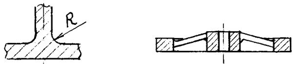 КОНСТРУИРОВАНИЕ ДЕТАЛЕЙ С УЧЕТОМ ЛИТЕЙНЫХ СВОЙСТВ СПЛАВА При конструировании литой детали необходимо учитывать литейные свойства заливаемого в форму сплава и процесс затвердевания отливки. Жидкотекучесть. При проектировании отливок необходимо назначить толщину стенок “d” обеспечивающую требуемую расчетную прочность и экономию металла. Однако при этом необходимо учитывать жидкотекучесть назначаемого для отливки сплава при температуре его разливки. Для чугуна d =2,5-5 мм,8-10 мм, для небольших, средних и крупных отливок соответственно. Для стали, обладающей худшей жидкотекучестью, чем чугун и бронза, соответственно 4-5, 10-12, 15-20 мм, для бронзы 2-3, 5-12, 12-15 мм. Процесс кристаллизации. Следует учитывать, что кристаллизация металла происходит перпендикулярно поверхности теплоотдачи. При неправильно выбранной конструкции отливки возможно снижение механических свойств отливки из-за неудачного расположения кристаллов, образование пористости и трещин. В процессе работы в этих может произойти разрушение детали: рис. 59а в местах А и Б, рис. 60а в месте А. При сопряжении стенок отливки нельзя допускать острых углов – возможное место образования трещин, стенки сопрягать радиусами (галтелями) рис 61. Линейная усадка. При конструировании литых деталей необходимо учитывать вредные последствия усадки. Например, при конструировании маховика колес нельзя допускать четного количества спиц. Т.к. в этом случае при усадке по диаметру в отливке образуется торможение усадки, которая может привести к появлению внутренних напряжений, вследствие чего в отливке могут образоваться трещины или коробление. В некоторых случаях спицы делают под углом к ободу Рис. 62 или спиральные рис. 63. Бруски лучше проектировать симметричными в поперечном сечении Рис. 64. Объемная усадка. Недопустимо большое местное скопление металла в отдельных частях отливки, которая, как правило, приводит к образованию усадочных раковин и усадочной пористости, что создает опасные, непрочные части узлов рис. 65а – неправильно, б – правильно.