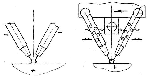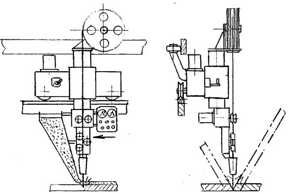 Применение автоматической и полуавтоматической сварки обеспечивает более стабильное качество шва и высокую производительность процесса. При автоматической дуговой сварке механизируется управление дугой и подача материала – сварочной проволоки, флюса или защитного газа. ЕЕ целесообразно применять при большой протяженности швов. Сварку малоуглеродистых и низколегированных сталей производят под слоем флюса. Флюс, подобно толстой обмазке на электроде, обеспечивает защиту шва от кислорода, азота и водорода воздуха, раскисляет и легирует шов, Рис. 76. Процесс образования шва под флюсом имеет свои особенности. При ручной сварке основной металл мало участвует в образовании шва. Шов образуется за счет наплавленного электродного металла и незначительного расплавления кромок. При сварке под слоем флюса дуга горит между концом электрода и изделием под слоем сыпучего вещества. Дуга утоплена в массе флюса и горит в жидкой среде расплавленного флюса, в газовом пузыре, образуемом газами и парами, непрерывно создаваемыми дугой. Дуга интенсивно расплавляет основной металл и образует глубокий кратер. Заполнение кратера происходит за счет расплавленного присадочного металла и за счет расплавленного вытесняемого дугой основного металла. В момент возбуждения дуга горит между концом электрода и основным металлом. При перемещении дуги столб ее отклоняется назад - в сторону, противоположную направлению сварки. Дуга плавит металл и вытесняет его назад. Расплавленный флюс изолирует от воздуха не только столб дуги, но и всю зону сварки. В результате значительного запаса теплоты шлак остается жидким до конца затвердевания ванны и не препятствует удалению газов. Слой нерасплавленного флюса замедляет процесс остывания ванны. По истечении некоторого времени шлаковый покров полностью затвердевает в виде корки и легко удаляется со шва. Для производства автоматической сварки применяются автоматы нескольких типов. Наиболее распространенными являются автоматы для напольных швов, называемые сварочными тракторами Рис. 77. Автомат состоит из самоходной тележки, штанги, поворачивающейся вокруг вертикальной оси. На одном конце штанги укрепляются катушка со сварочной проволокой и пульт управления; на другом – коробка передач с роликами для подачи и правки проволоки и бункер с флюсом. Тележка имеет два колеса направляющих, имеющих V-образную канавку и два колеса опорных. Трактор перемещается по направляющей, уложенной параллельно шву. Для того, чтобы электрод всегда располагался по оси разделки шва, спереди укрепляются ролики, идущие по разделке, они как бы ведут за собой головку с мундштуком, через который проходит проволока. Другой тип автоматов – автоматы с тележкой велосипедного типа, имеющие длинную консоль, Рис. 78, позволяющие варить швы, находящиеся в глубине конструкции. Тележка у них на двух колесах. Третьей опорой, препятствующей опрокидыванию, является ролик, укрепленный на тележке. Существуют в каждой отрасли промышленности специальные сварочные автоматы, предназначенные для сварки изделий этой отрасли. Для сварки нержавеющих сталей, алюминиевых сплавов и титановых сплавов в качестве защитной среды применяются инертные газы – аргон и гелий. Для сварки низкоуглеродистых сталей применяется углекислый газ CO2. Автоматы для сва