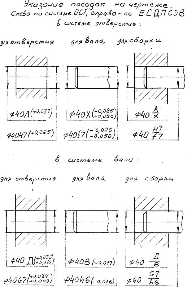 Нижнее отклонение основного вала – отрицательное, верхнее – равно нулю, что соответствует отклонению h в системе ЕСДП. Как указываются посадки в двух системах (ОСТ и ЕСДП СЭВ) и в системе вала и отверстия, показано на Рис. 94.