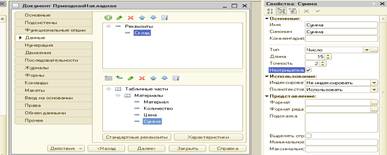 Добавить табличную часть с именем Материалы, установить проверку заполнения – выдавать ошибку и реквизитами: Материал, тип СправочникСсылка.Номенклатура Количество, тип Число, длина 15, точность3, неотрицательное Цена, тип Число, длина 15, точность 2, неотрицательное Сумма, тип Число, длина 15, точность 2, неотрицательное. Для каждого реквизита табличной части установить свойство Проверка заполнения – Выдавать ошибку. На закладке НУМЕРАЦИЯ свойство –Автонумерация включено Настроить интерфейс приложения - подсистема УчетМатериалов – Панель действий:Создать – включить видимость у команды Приходная накладная:создать.