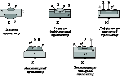 Рис. 2. Условные обозначения биполярных транзисторов: а) p‑n‑p, б) n‑p‑n По технологии изготовления транзисторы делятся на сплавные, планарные, а также диффузионно‑сплавные, мезапланарные и эпитаксиально‑планарные (рис. 3).