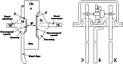 Рис. 4. Конструктивное оформление биполярного транзистора По характеру движения носителей тока в базе различают диффузионные и дрейфовые биполярные транзисторы.