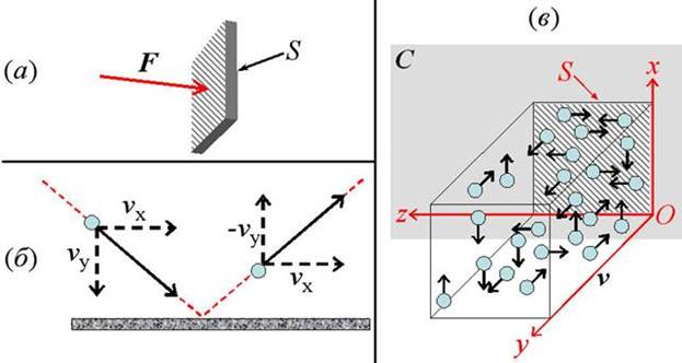 Пусть в единице объёма газа находится n молекул. Упростим себе задачу, считая, что все молекулы газа движутся с одинаковой скоростью, v. При этом 1/3 всех молекул движется вдоль оси Ox, и столько же – вдоль оси Oy и Oz (см. рис. 22в). Пусть половина молекул, движущихся вдоль оси Oy, движется в сторону стенки С, а остальные – в противоположную сторону. Тогда, очевидно, количество молекул в единице объёма, несущихся в сторону стенки С, составит n/6.