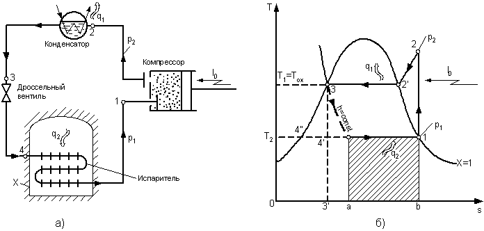 Для дальнейшего снижения температуры хладагента можно было бы применить расширительную машину и осуществлять в ней адиабатное расширение 3-4’ (с производством внешней работы за счет убыли внутренней энергии). Однако для упрощения установки и обеспечения гибкой регулировки расширительную машину заменяют регулирующим дроссельным вентилем, в котором хладагент после конденсатора дросселируется с понижением давления и температуры (процесс 3-4). На диаграмме T-s процесс дросселирования, как необратимый, условно показан пунктиром 3-4 (h=const). После дроссельного вентиля (точка 4) образовавшаяся парожидкостная смесь (влажный пар) с низкой температурой T2 поступает по трубам в испаритель, который находится в холодильной камере X. В испарителе при постоянных температуре T2 и давлении p1 происходит отбор теплоты q2 от охлаждаемых объектов (производство холода) и за счет этого испарение (кипение) хладагента (процесс 4-1). Образовавшийся пар (точка 1) вновь засасывается компрессором, и цикл повторяется. Холодильный коэффициент:
