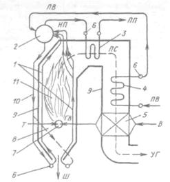 Рисунок 16.1 - Вертикально-водотрубный барабанный паровой котел с естественной циркуляцией: ПВ — подача питательной воды; НП — линия насыщенного пара; ПП — отвод перегретого пара; Т — подача топлива к горелке; В — подвод воздуха к воздухоподогревателю; ГВ — горячий воздух; ПС — У Г — тракт продуктов сгорания топлива и уходящих (из котла) газов; Ш — шлак; 1 — экранные трубы; 2 — барабан; 3 — пароперегреватель; 4 — водяной экономайзер; 5 — воздухоподогреватель; 6 — коллекторы; 7 — горелка; 8 — топка; 9 контур (стена) топки и газоходов; 10 — опускная труба; 11 — излучающий теплоту топочный факел.