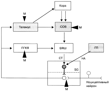 Рис. 38. Механизм анальгетического действия морфина. СОВ – серое околоводопроводное вещество; ПГКЯ – парагигантоклеточное ядро; БЯШ – большое ядро шва; ГП – голубое ятно; SG – substantia gelatinosa;