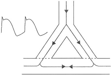 Рис. 46. Механизм возникновения аритмии по типу reentry. Хинидин полностью блокирует проведение импульсов в области однонаправленного блока (переводит однонаправленный блок в полный блок) и прекращает повторный вход возбуждения (рис. 47).