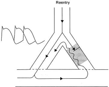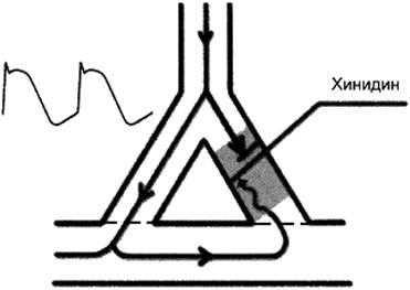 Рис. 47. Действие хинидина при аритмиях по типу reentry.