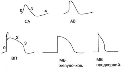 Рис. 50. Потенциалы действия кардиомиоцитов. СА – синоатриальный узел; АВ – атриовентрикулярный узел; ВП – волокна Пуркинье; MB – мышечные волокна.
