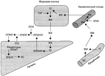 Основные носители холестерина – ЛПНП; они на 55 % состоят из холестерина и эфиров холестерина. ЛПНП образуются из ЛППП, а ЛППП – из ЛПОНП. В норме ЛПНП выполняют полезную роль: являются «разносчиками» холестерина, который необходим всем клеткам для образования клеточных мембран. Кроме того, из холестерина синтезируются глюкокортикоиды, минералокортикоиды, половые гормоны. В печени из холестерина образуются желчные кислоты. Для усвоения холестерина в клетках синтезируются рецепторы ЛПНП. Эти рецепторы встраиваются в клеточные мембраны. Циркулирующие в крови ЛПНП соединяются с рецепторами, после чего происходит рецептор-зависимый эндоцитоз ЛПНП (поглощение ЛПНП клетками). В клетках из ЛПНП высвобождается холестерин, который используется по назначению. При достаточном поступлении холестерина синтез рецепторов ЛПНП прекращается. Образование ЛПНП показано на рис. 65. В стенке кишечника пищевые холестерин и триглицериды участвуют в образовании ХМ, которые через лимфатические сосуды попадают в общий кровоток. В сосудах скелетных мышц и жировой ткани ХМ подвергаются действию липопротеинлипазы эндотелия сосудов и составляющие их триглицериды расщепляются; высвобождаемые жирные кислоты проникают в мышечные и жировые клетки.