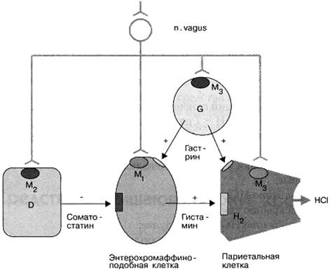 Хлористоводородная кислота (НCl) секретируется париетальными клетками желудка. Активность париетальных клеток повышают: 1) гистамин, который выделяется из энтерохромаффиноподобных клеток желудка и стимулирует гистаминовые Н2-рецепторы париетальных клеток. При этом активируется аденилатциклаза, повышается уровень цАМФ, активируется протеинкиназа, которая фосфорилирует (активирует) Н+ K+-АТФазу; 2) гастрин (выделяется G-клетками пилорического отдела желудка и стимулирует энтерохромаффиноподобные и париетальные клетки); 3) ацетилхолин, который выделяется из окончаний парасимпатических волокон и стимулирует париетальные клетки (М3-холинорецепторы), энтерохромаффиноподобные клетки (М1-холинорецепторы) и G-клетки продуцирующие гастрин (М3-холинорецепторы) (рис. 67).