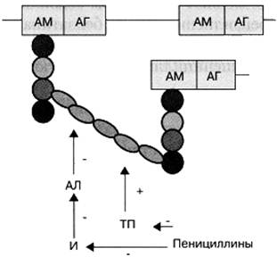 Рис. 82. Механизм действия пенициллинов. AM – Ν-ацетилмурамат; АГ – Ν-ацетилглюкозамин; ТП – транспептидаза; АП – аутолизины; И – ингибитор аутолизинов.