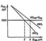 Рис. 48 - Оптимальное количество используемого ресурса для конкурентной фирмы и для фирмы - несовершенного конкурента на рынке готовой продукции: MRP - предельная доходность ресурса, MCres - предельные издержки на ресурс