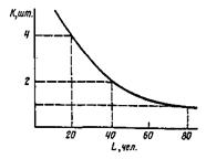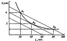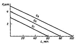 Рис. 49 - График возможных вариантов сочетания двух видов ресурсов, необходимых для выполнения заданного объема работ: К - число машин, L - численность работников