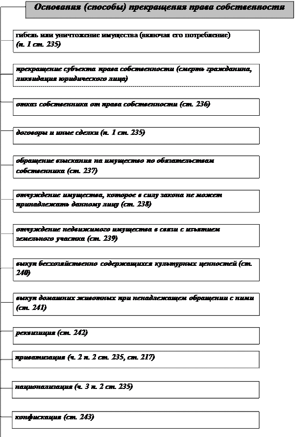 Основаниями прекращения права собственности являются: Добровольное прекращение своего права собственником: · отчуждение · отказ · гибель или уничтожение имущества · утрата права собственности по иным основаниям (в порядке приватизации) Принудительное изъятие имущества в случаях прямо предусмотренных законом: · обращение взыскания на имущество по обязательствам · отчуждение имущества, которое по закону не может принадлежать данному лицу · отчуждение недвижимого имущества в связи с изъятием участка · выкуп бесхозяйственно содержимых культурных ценностей, · выкуп домашних животных при ненадлежащем обращении с ними · реквизиция · конфискация · отчуждение имущества в предусмотренных законом случаях (при национализации имущества)