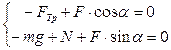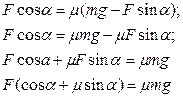 45. Груз массой 97 кг перемещают равномерно по горизонтальной поверхности с помощью верёвки, образующей угол 30° с горизонтом. Найдите силу натяжения верёвки, если коэффициент трения равен 0,2. Решите эту задачу для случая, когда груз толкают равномерно, прилагая к нему усилия с помощью стержня, наклонённого к горизонтальной поверхности под углом 30°.