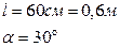 48. Груз, подвешенный на нити длиной l = 60 см, двигаясь равномерно, описывает в горизонтальной плоскости окружность. С какой скоростью v движется груз, если во время его движения нить образует с вертикалью постоянный угол