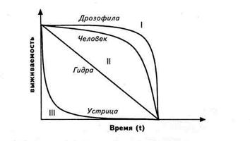 На основе данных о рождаемости и смертности в популяциях строят кривые выживания. По оси абсцисс отмечают процент выживания (продолжительность жизни от общей продолжительности) и по оси ординат (время или скорость).