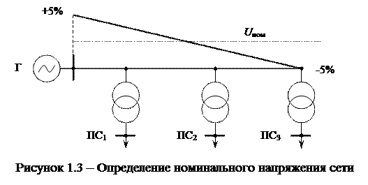 Выработка, передача и потребление электроэнергии выполняется при различ-ных напряжениях: генерация при напряжении до 30 кВ, передача – при напряжении 35 кВ и выше, потребление – сотни и тысячи вольт. Номинальным напряжением элементов электрической сети (электроприемники, генераторы, трансформаторы) называется то напряжение, на котором эти элементы имеют наиболее целесообразные технические и экономические характеристики. Номинальные напряжения устанавливаются государственным стандартом (ГОСТ).