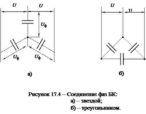 где Q БК – требуемая мощность БК; Q к ном – номинальная мощность конденсатора. В сетях трехфазного тока конденсаторы включаются звездой и треугольником (рис. 17.4). Мощность батареи конденсаторов рассчитывается по формуле: