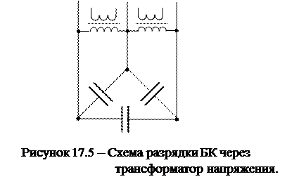 в три раза больше, чем при соединении конденсаторов звездой. При соединении конденсаторов в звезду режим работы нейтрали БК определяется режимом работы нейтрали сети, где она установлена. Батареи конденсаторов бывают регулируемые и нерегулируемые. В нерегулируемой БК число конденсаторов неизменно. В регулируемой БК в зависимости от режима работы часть конденсаторов можно отключать. Отключение может выполняться как вручную, так и автоматически. Так как сразу отключается часть конденсаторов, то мощность БК изменяется не плавно, а ступенчато. Регулирование бывает одноступенчатое и многоступенчатое. Одноступенчатое регулирование – это фактически нерегулируемая БК, так как можно включить или отключить сразу все конденсаторы. При многоступенчатом регулировании каждая секция БК снабжена контактором или выключателем. При отключении конденсаторов они автоматически разряжаются на активное сопротивление, присоединенное к БК. В качестве разрядного сопротивления для конденсаторных установок 6-10 кВ используют активное сопротивление трансформаторов напряжения (рис. 17.5).