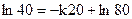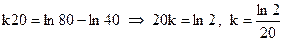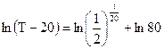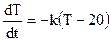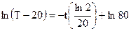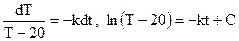 Произвольную постоянную С и коэффициент k можно найти из начальных условий. Подставляя в (*) t=0 мин., Т=100о, получим При t=20 мин., Т=60о, следовательно: