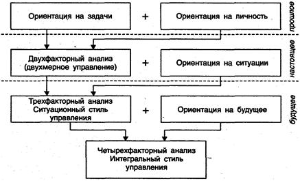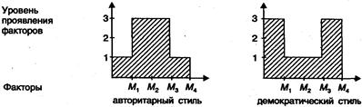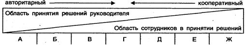 Среди особенных факторов выделяются: • удовлетворенность трудом; • взаимоотношения в коллективе; • организация труда; • удовлетворенность оплатой труда; • применяемые руководителем методы управления в тех или иных ситуациях. В стилях управления фокусируют свое влияние другие объективно-субъективные и общие (объективные) факторы: • регламентированные общественные требования; • средства управленческого труда; • доступность и состояние социальной, экономической и технической информации; • общие характеристики крупномасштабных объектов управления — исторические факторы, территориальные факторы, национальные традиции. Влияние этих факторов имеет существенный характер, определяющий контуры всех стилей управления. Но для каждого в отдельности это влияние опосредовано состоянием ситуационных и поведенческих факторов. Рассматривая стиль как синтетический индикатор отношений управления, в его формировании целесообразно выделить три уровня. 1. Уровень личности руководителя. Для него характерны субъективные факторы, индивидуальность стиля, оценка стиля, прежде всего по качествам руководителя и применяемым методам управления. 2. Уровень группы. Для него характерны взаимосвязи единичных и особенные факторов, оценка стиля управления по состоянию характеристик группы. 3. Уровень процессов. Для него характерны структурные взаимосвязи особенных и общие факторы, а также характеристики трудовых процессов, оценка стиля по результатам производства, тестовая оценка. Независимо от уровней на формирование оказывают влияние не столько те или иные комплексы факторов, сколько взаимосвязи в этих факторах: • структура методов управления; • структура управленческих решений; • структура задач и функций управления; • организационная структура управления. Наиболее объективную оценку стиля управления может дать только структурный анализ стилеобразующих факторов. Одним из критериев различия стилей управления является разделение пространства принятия управленческих решений. Крайним стилям – авторитарному и кооперативному - соответствуют крайние точки на противоположных концах отрезка стилей. Промежуточные формы дифференцированы уровнем имеющихся прав на содействие руководителю в процессе принятия решения. Этот уровень определяет соотношение между авторитарным и либеральным управлением. Может быть несколько дифференциаций — от 3 до 7, например шесть типов стилей вместе с экстремальными: руководитель решает и приказывает (авторитарный стиль); руководитель решает, приказывает, но и обосновывает свои решения; руководитель допускает сотрудников к обсуждению вопросов, прежде чем он их решит; руководитель вначале излагает свой план, потом принимает решение; руководитель излагает проблему, определяет область ее решения и вместе с сотрудниками принимает решение; руководитель принимает развивающееся решение вместе с сотрудниками (кооперативный стиль). В зависимости от степени права решений и рамок компетенции сотрудников дифференциация стилей может быть несколько иной.