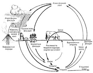 1. Колообіг речовин. Взаємодія компонентів екосистеми між собою здійснюється шляхом обміну енергії та речовин. Елементами колообігу речовин є процеси послідовного перетворення, розкладення та деструкції синтезованих раніше сполук під впливом абіогенних або біогенних впливів довкілля; постійне або періодичне утворення найпростіших мінеральних і органо-мінеральних компонентів. В природі протікають абіогенні і біологічні цикли. Не порушені вони носять майже замкнутий характер. Ступінь їх відтворення, яке повторюється, дуже завелика – 90 – 98%. Завдяки цьому підтримується відома постійність концентрації та кількості компонентів, привнесених в колообіг. Однак неповна замкнутість колообігів призводить до міграції і диференціації елементів та сполук у просторі, у різноманітних середовищах та компонентах біосфери, концентрації або розпорошенню тих або інших елементів. Населення Землі у 1950 р. – 2,5 млрд., у 1986 – 4,9 млрд. чол. Його зростання та посилення діяльності сприяє змінам колообігів головних біофільних елементів. 2. Циркуляція води. Важлива роль у глобальному кругообігу речовин належить циркуляції води між океаном, атмосферою та верхніми шарами літосфери.
